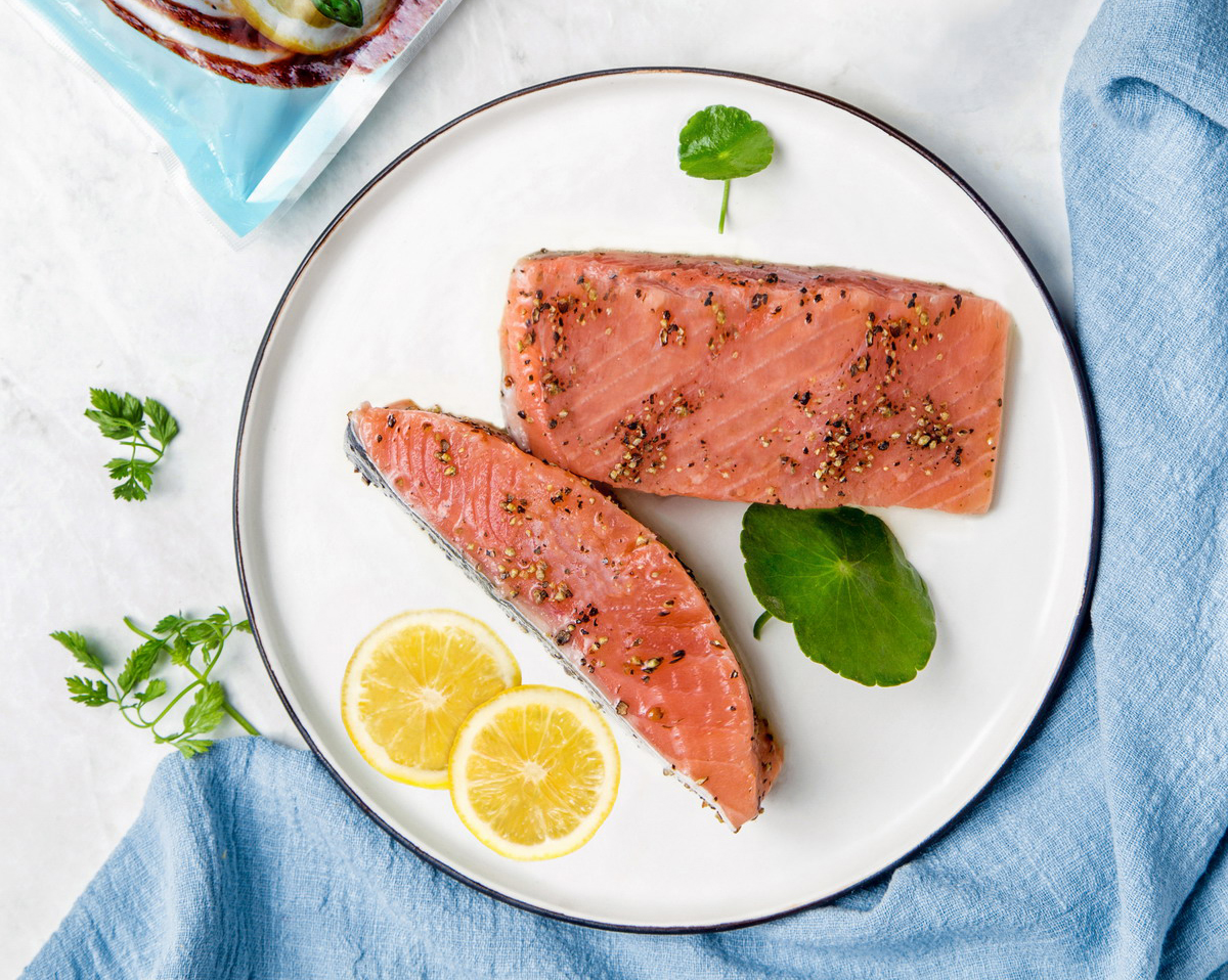 食用方法:煎鍋加油燒至5成熱,放入緩化后的黑椒三文魚,以小火,每面各煎2-3分鐘,呈金黃色即可