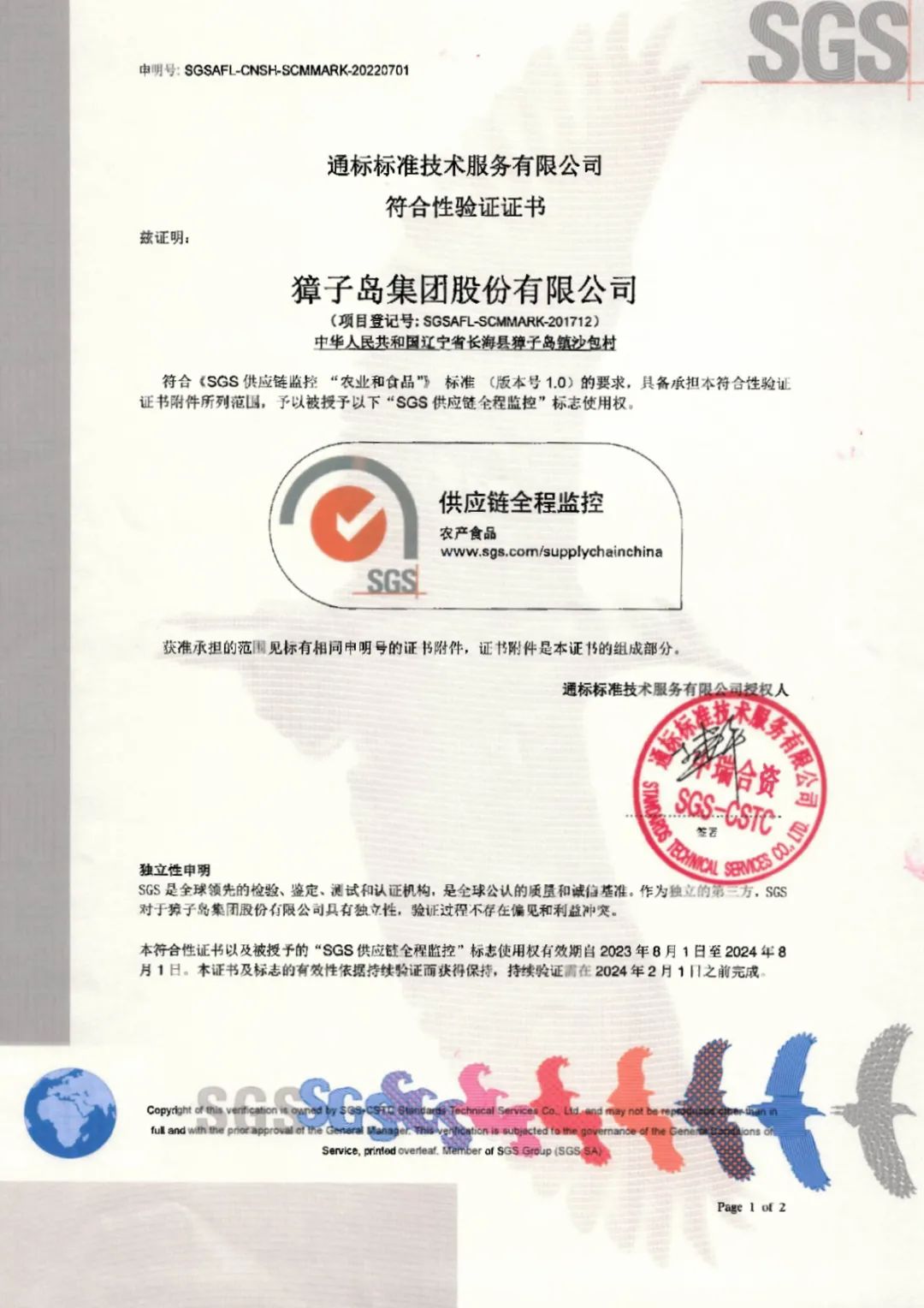 2023年8月1日獐子島集團(tuán)順利取得SGS SCM MARK(SGS供應(yīng)鏈全程監(jiān)控)授權(quán)證書,標(biāo)志著獐子島集團(tuán)申請(qǐng)認(rèn)證范圍內(nèi)的原料基地、加工廠、物流及銷售終端的管理及加工的海參制品,自2018年首次取得SGS SCM MARK授權(quán)以來連續(xù)6年滿足SGS SCM MARK標(biāo)準(zhǔn)要求。獐子島海參也成為全球唯一取得SGS SCM MARK授權(quán)使用的水產(chǎn)品。