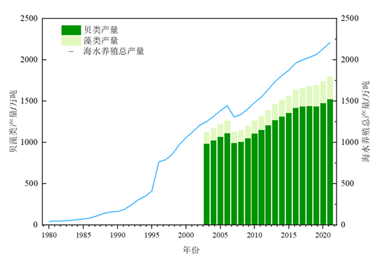 圖2 1980年~2021年中國海水養(yǎng)殖總產(chǎn)量及貝藻類產(chǎn)量