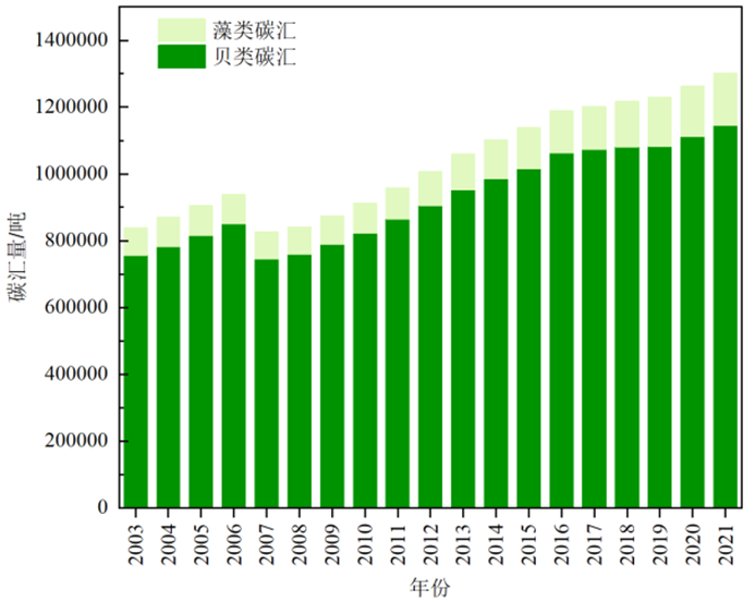 根據(jù)《中國漁業(yè)統(tǒng)計年鑒》所統(tǒng)計的中國人工大型經(jīng)濟海藻和貝類產(chǎn)量數(shù)據(jù),并利用參考文獻的估算結(jié)果并根據(jù)估算方法對貝、藻類產(chǎn)生的碳匯進行估算, 2003年~2021年我國大型藻類年碳匯量為8.0萬~15.6萬t,貝類年碳匯量為76萬~114萬t,19年間貝藻類總碳匯量為1967萬t,且呈現(xiàn)出逐年上升的趨勢(圖3)。如果被吸收的碳全部從大氣中獲得,則中國僅貝藻類養(yǎng)殖每年就可多從大氣中吸收約100萬t以上的碳;如果我國貝海藻養(yǎng)殖產(chǎn)量每年按現(xiàn)有速度增加,那么貝藻類養(yǎng)殖將對增加大氣CO2的匯具有重要意義。2008~2015年我國各沿海省份(不包括臺灣和港澳地區(qū))貝藻類碳匯總量表現(xiàn)出山東省最高,其次是福建省和遼寧省,各沿海省份貝類碳匯量趨勢與貝藻類碳匯總量一致,藻類碳匯量為福建省最高,其次是山東省和遼寧??;廣西省和河北省的碳匯轉(zhuǎn)化比最高;同時我國四個海域海水養(yǎng)殖業(yè)碳匯總量為黃海>東海>渤海、南海,但南海的碳匯轉(zhuǎn)化比最高。