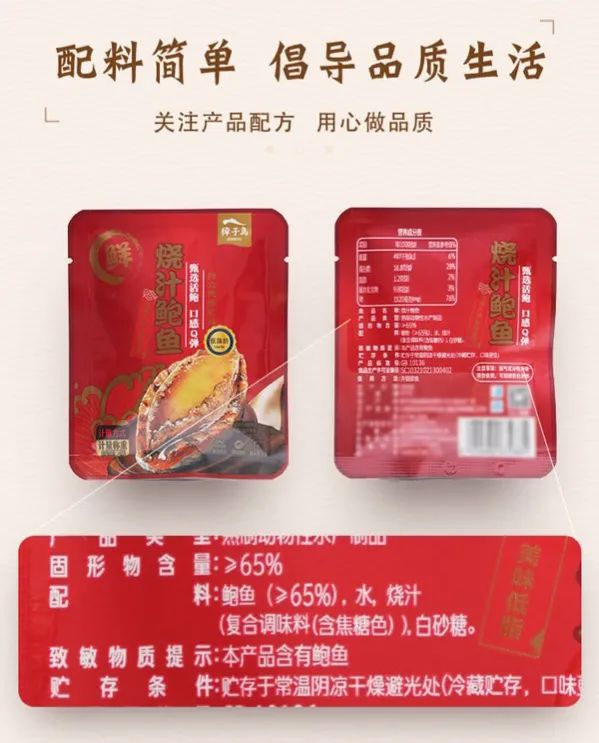 燒汁鮑魚采用獨立小包裝,更符合現(xiàn)代人的飲食習慣,口袋里的小零食,揣兜里隨時開吃。