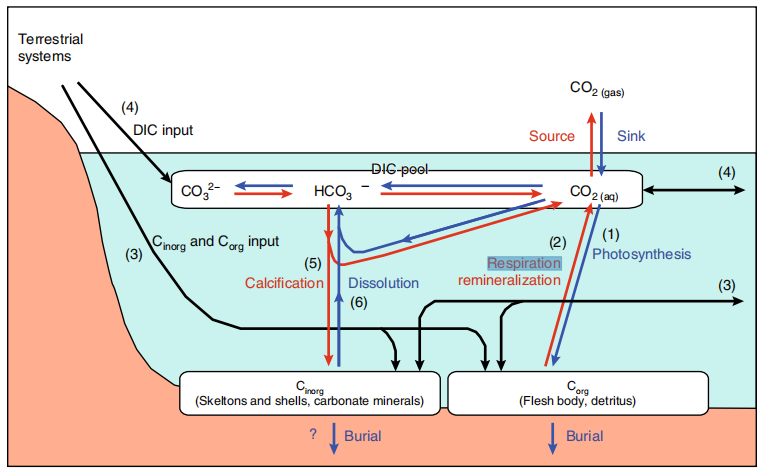 圖1 空氣-水-CO2交互的碳生物地球化學(xué)過(guò)程概念圖。藍(lán)線(xiàn)表示大氣CO2吸收的過(guò)程,紅線(xiàn)表示CO2排放到大氣中的過(guò)程。地表水中的CO2濃度主要決定通量的方向。地表水CO2濃度由溶解無(wú)機(jī)碳(DIC)中的碳酸鹽平衡決定,并受生態(tài)系統(tǒng)凈生產(chǎn)(光合作用、呼吸和再礦化的平衡)影響,直接調(diào)節(jié)DIC、外來(lái)顆粒物和溶解有機(jī)碳(Corg)、顆粒無(wú)機(jī)碳(Cinorg)以及來(lái)自陸地系統(tǒng)和沿海海洋的DIC輸入、凈Cinorg生產(chǎn)(鈣化和溶解的平衡),直接調(diào)節(jié) DIC 和總堿度(TA)和溫度(CO2溶解度)。鈣化作用產(chǎn)生的 CO2在正常海水中的比例(釋放的CO2/沉淀的 Cinorg)約為 0.6 。