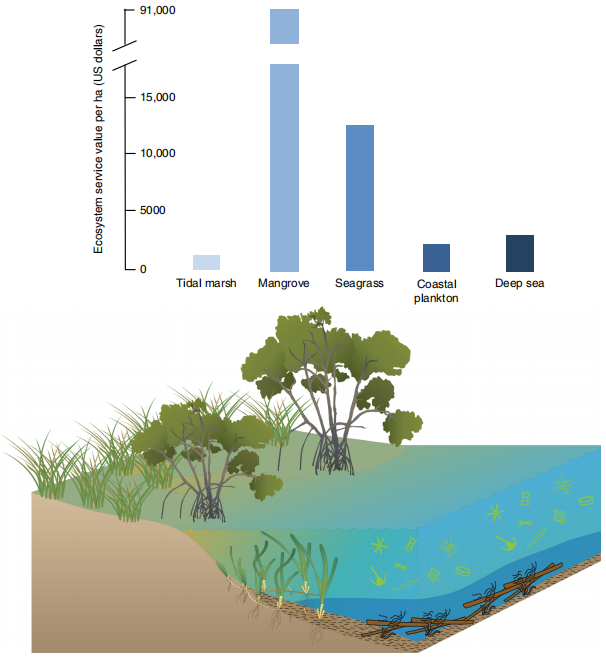 圖2 每公頃藍(lán)碳生態(tài)系統(tǒng)的經(jīng)濟(jì)價(jià)值估算