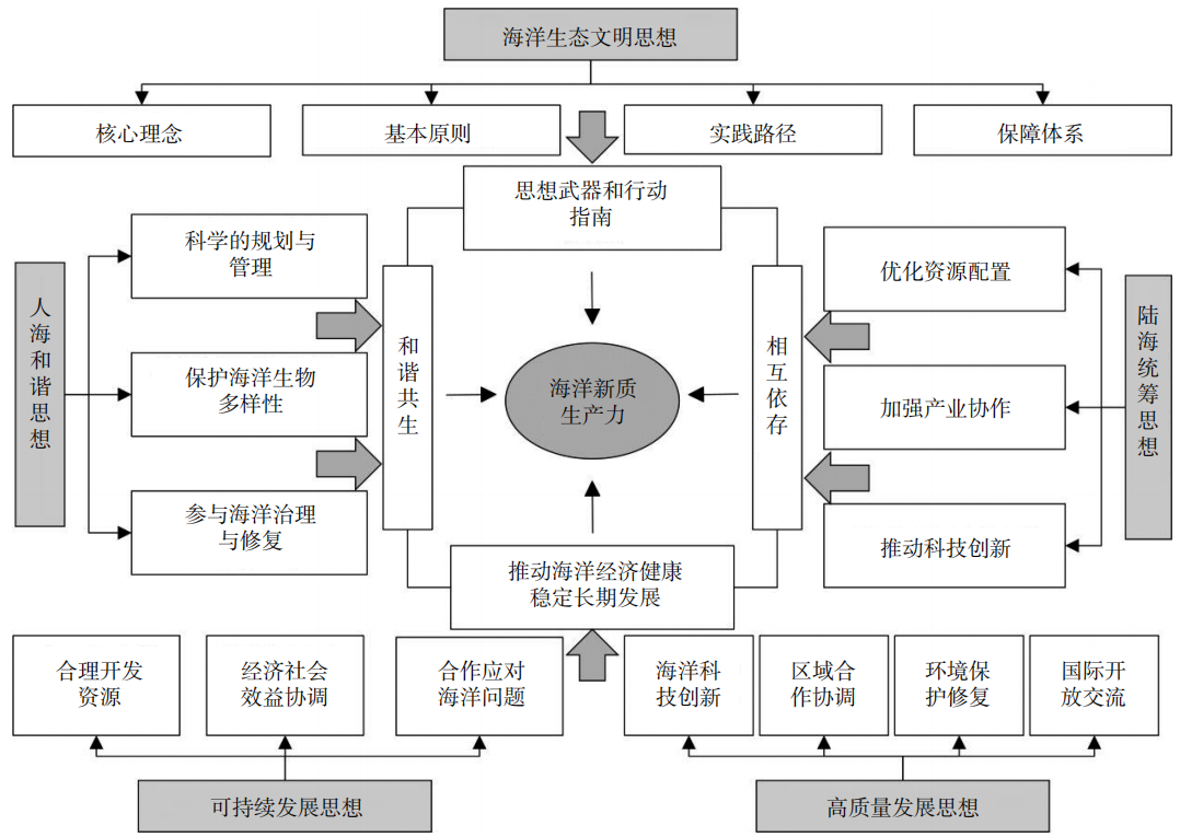 海洋生態(tài)文明思想,作為人類對(duì)海洋環(huán)境及其生態(tài)系統(tǒng)的新認(rèn)識(shí),強(qiáng)調(diào)人與自然和諧共生的理念,核心理念為尊重自然、順應(yīng)自然、保護(hù)自然。海洋生態(tài)文明思想不僅指導(dǎo)著海洋資源的合理利用和保護(hù),還推動(dòng)著海洋經(jīng)濟(jì)的綠色轉(zhuǎn)型,影響海洋新質(zhì)生產(chǎn)力的形成。